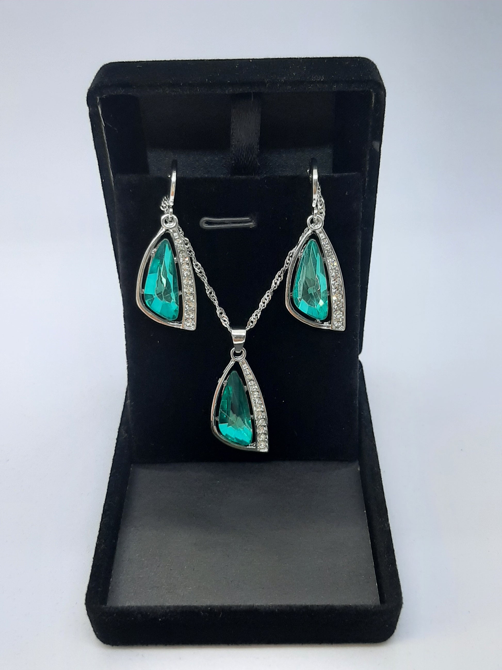 Ensemble de bijoux pour femmes et filles en argent sterling 925 : créoles élégantes, pendentif raffiné , collier assorti, ornés de cristaux CZ scintillants et de grandes pierres de couleur Emeraude. Idéal pour les fiançailles, les tenues de travail ou les occasions spéciales.